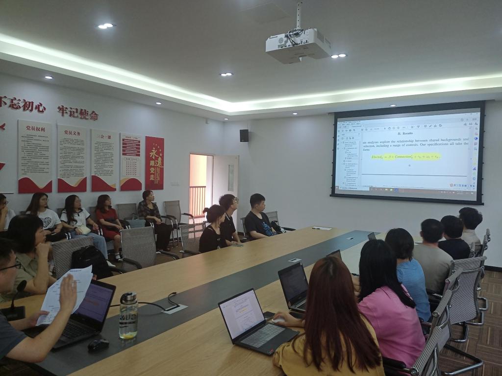 此次活动上,黄潇老师为同学们分享了AER杂志上发表的论文《Social Ties and the Selection of China’s Political Elite》。黄老师系统地分析了这篇文章的逻辑结构、数据来源与筛选、实证研究框架,并现场运行程序包为同学们展示了文章当中的主要研究结果。整个分享过程中黄老师深入浅出、严谨但又不失幽默,向同学们示范了应该如何读文献、如何分析文献、如何举一反三从文献中获得更多的研究启示。