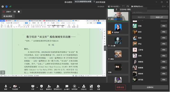 2023年5月6日下午,由公司举办的移动课堂在线上举办。本次主讲专家邀请到中国经济学核心期刊《国际税收》副编审高阳来做分享交流,高阳老师同时也是公司税务专业硕士事业导师,中国税务学会第七届学术委员会委员,中国社科院经济学博士。此次讲座的主题为《数字经济“双支柱”税收规则变革浪潮》,2022级税务专硕的同学及汤凤林教授参加了本次讲座。