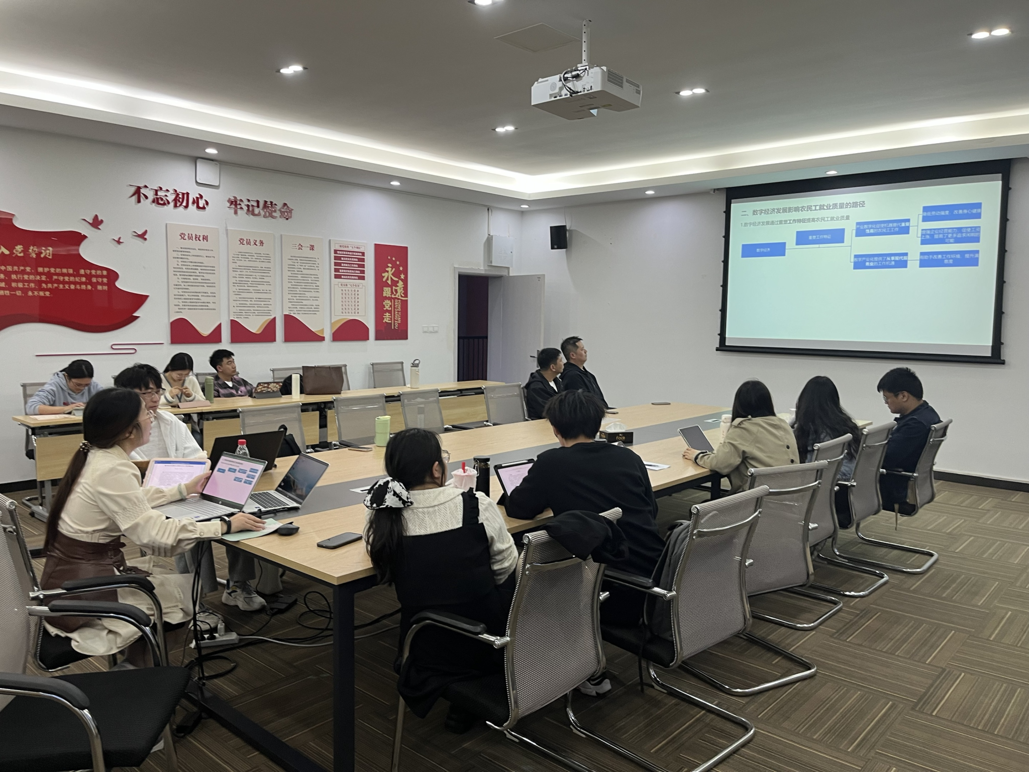 随后的学术报告环节,呈现了研究生们对经济理论与实践问题的深度思考。2021级西方经济学专业的陈祠标同学围绕“城市群人口集聚对域内企业创新的促进作用”进行了系统阐述,其研究视角新颖,分析透彻。2022级产业经济学专业的覃龙静同学则探讨了“数字经济发展在促进农民工高质量就业方面的机制与挑战”,尤其针对“数字鸿沟”引发的讨论,为解决农民工就业问题提供了新视角。紧接着,付俊治同学分享的“企业数字化转型背景下供应链策略选择的实证研究”,展示了严谨的实证分析方法,为在场师生提供了宝贵的研究范例。