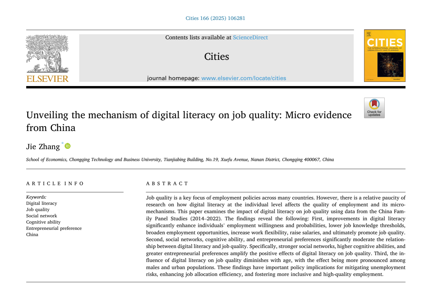 2025年7月22日,K1体育张杰老师以独立作者在SSCI 1区、JCR 1区TOP经济类期刊《Cities》在线发表论文《Unveiling the mechanism of digital literacy on job quality: Micro evidence from China》。