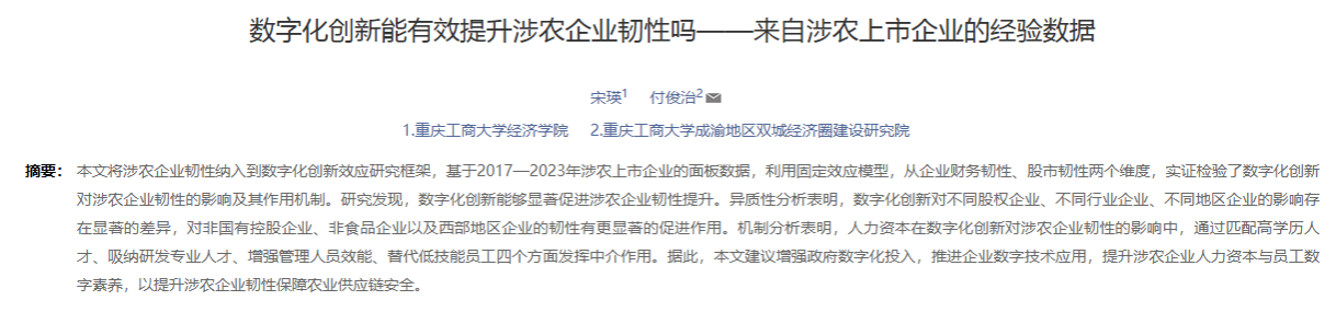 2025年7月,K1体育宋瑛教授在重要学术期刊《农业技术经济》发表学术论文《数字化创新能有效提升涉农企业韧性吗?——来自涉农上市企业的经验数据》。