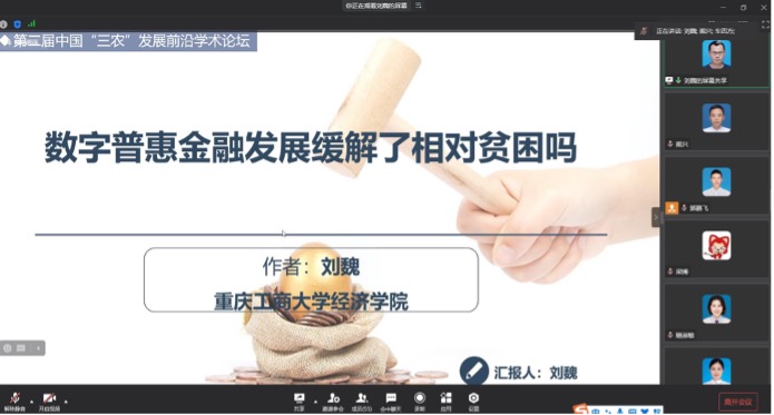 K1体育青年教师刘巍博士做了《数字普惠金融发展缓解了相对贫困吗?》的学术报告。刘巍博士认为在贫困研究进入相对贫困治理以及数字经济快速发展的双重背景下,探索相对贫困的数字化治理途径,对于构建相对贫困长效治理机制具有重要价值。刘巍博士基于中国家庭追踪调查2014—2018年的数据,将相对贫困区分为主观和客观两种类型,并运用条件混合过程(CMP)等研究方法,分析了数字普惠金融对居民相对贫困的影响。刘巍博士研究发现数字普惠金融指数每增加1%,客观相对贫困的发生概率下降2.12%,主观相对贫困的发生概率下降0.96%。刘巍博士认为数字普惠金融发展有效缓解了城乡居民的相对贫困状况,其作用机制在于数字普惠金融通过降低信贷成本、积累人力资本和社会资本缓解客观相对贫困,通过积累人力资本和社会资本缓解主观相对贫困。
