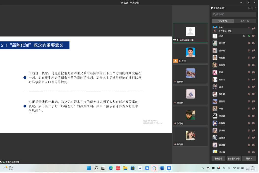 在本次活动中,2021级政治经济学专业两位同学吴艳琼和沈涛分别分享了近期阅读的文献。吴艳琼在分享《中国开放型经济学的马克思主义政治经济学逻辑》一文时,主要从马克思主义基本原理、社会主义经济发展对外经贸关系的理论依据、中国开放型经济发展中的理论总结与升华以及习近平开放发展新理念四个方面展开,并在最后提出自己关于改进文献框架的思考;沈涛在分享《马克思“新陈代谢”理论的生态意蕴》一文时,先是说明了选择分享这篇文献的主要原因,然后对整篇文章的框架作了大致梳理,最后对文章的各部分内容作了简要介绍。两位主讲人文献分享结束后,对文章当中涉及到一些问题与参会的老师和同学进行了交流。