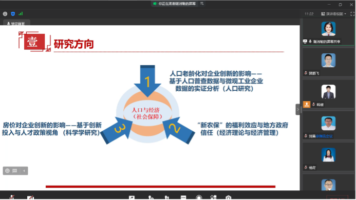 青年教师随淑敏博士作了《人口老龄化对企业创新的影响——基于人口普查数据与微观工业企业数据的实证分析》的学术报告。随淑敏博士将地级市的人口普查数据和微观工业企业数据库相匹配,分析了人口老龄化对企业创新的影响。通过研究,随淑敏博士认为现阶段低水平的人口老龄化显著促进了中国企业创新,但长远来看,当人口老龄化超过一定的拐点值时,将抑制企业创新;相对于其他类型的企业,人口老龄化对非国有企业和资本密集型企业创新的促进作用更强;人口老龄化对东部和中部地区的企业创新都产生了促进作用,而对西部地区的企业创新产生了抑制性影响;人口流动在一定程度上抑制了人口老龄化对东部地区企业创新的促进作用。据此,随淑敏博士提出了优化企业生产要素投入、培养质量型人口红利、推动区域创新协调发展等建议。
