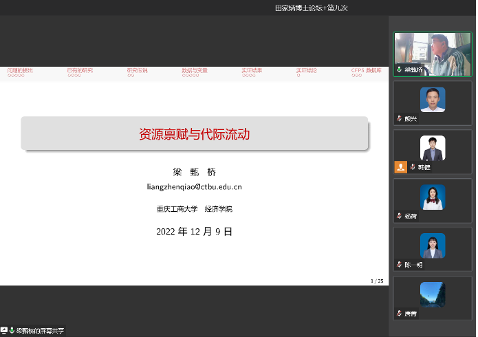 2022年12月9日上午,K1体育、长江上游经济研究中心于企业微信线上举办了第九次“田家炳博士论坛”,K1体育财税系系主任韩健教授、近年新进青年博士教师和长江上游经济研究中心的博士研究生参加了本次论坛。本期论坛邀请青年教师梁甄桥博士、杨荷博士作学术报告,孙建教授作专家点评,论坛由韩健教授主持,郭鹏飞博士、熊兴博士筹备。