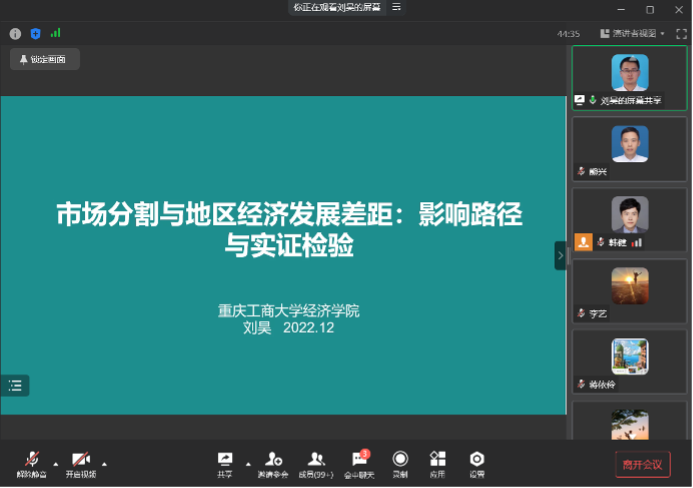 青年教师刘昊博士作了《市场分割与地区经济发展差距:影响路径与实证检验》的学术报告。刘昊博士认为市场分割是导致我国区域经济发展不平衡的重要影响因素。刘昊博士基于2005-2019年中国9个城市群140个城市的数据,实证研究了市场分割对地区经济发展差距的影响机制,并通过多重中介效应模型实证检验其影响路径。通过研究,刘昊博士发现中国地区经济发展差距与市场分割水平的南北方差异较大。市场分割与地区经济发展差距存在“U”形关系,即较低水平的市场分割能够缩小地区经济发展差距,而较高水平的市场分割则会扩大地区经济发展差距;同时,市场规模和市场竞争是市场分割影响地区经济发展差距的重要中介渠道,且市场规模的影响更为显著;此外,南北方城市群市场分割对地区经济发展差距的影响存在差别,位于北方的城市群较高水平的市场分割并未带来地区经济发展差距的扩大。