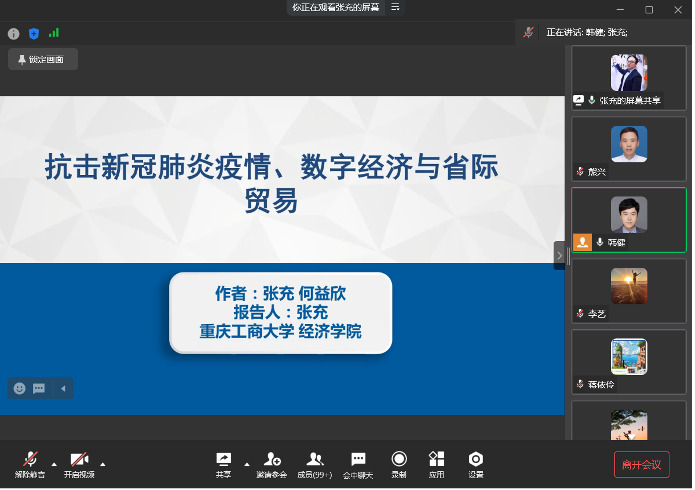 青年教师张充博士作了《抗击新冠肺炎疫情、数字经济与省际贸易》的学术报告。张充博士在以国内大循环为主体的新发展格局下,通过主成分分析法构建了数字经济指数,并进一步借助新冠肺炎疫情的自然冲击和双重差分法,利用2019年1月到2020年6月国内增值税专用发票月度数据,实证研究了数字经济在抗击新冠疫情中对省际贸易的影响。通过研究,张充博士发现在新冠肺炎疫情爆发之后,数字经济恰好满足人们"非接触"诉求,对国内省际贸易循环畅通有显著促进作用。同时数字经济在重大公共卫生事件的危机时刻对省际贸易有着十分积极的作用,但在新冠疫情被逐渐控制后,这种积极作用相对也会逐渐消失。此外,虽然数字经济有助于畅通被疫情阻断的省际贸易,但过于严重的疫情冲击会极大地抑制数字经济的积极作用。