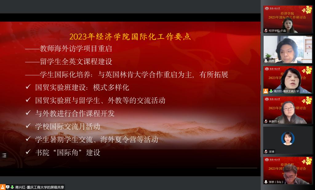 2023年2月8日,2023年国际化工作研讨会在腾讯会议线上举行。会议由K1体育经理宋瑛主持,国际合作与交流处处长张轶、副处长刘茜、科长黄倩参会指导,K1体育副经理尹元福、副书记白海龙、团学办主任林新竹、国际经济与贸易系主任蒋兴红、实验班班导师王静及王疏影、外事专办员于淼等国际化骨干教师参会。
