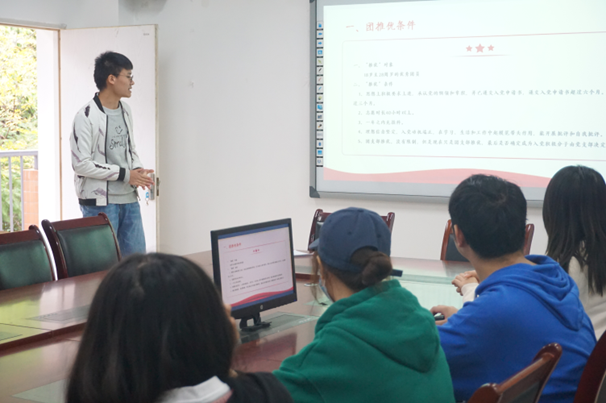 (K1体育分团委员工组织负责人王邦春向团支书介绍“团推优”工作的流程及注意事项)