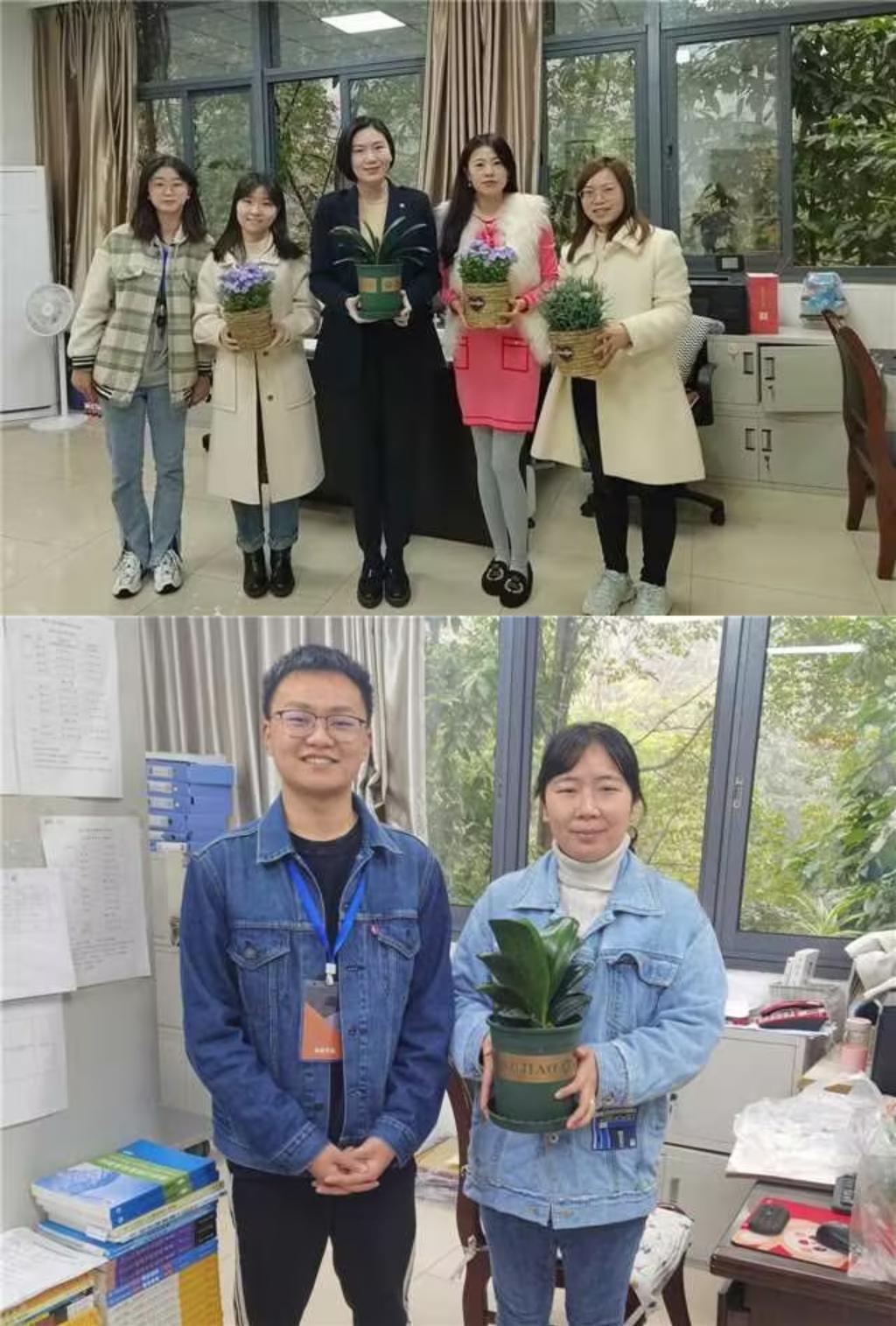 上午十点,献花活动正式开始。员工助理们利用课间时间将鲜花盆栽搬到办公室,分成若干小组为李自维书记,宋瑛经理,雷菁组织员,尹元福副经理,白海龙副书记以及各个办公室的老师献上鲜花盆栽,并合影留念。献花过程中,每位老师都真切地感受到了员工助理们浓浓的情意,老师们接过鲜花,不仅是惊喜和感动,更多的还是幸福。朵朵鲜花传真情,句句祝福暖师心。当芬芳的鲜花和老师们的笑脸融汇在一起,办公室里洋溢的是一片温馨和甜蜜。