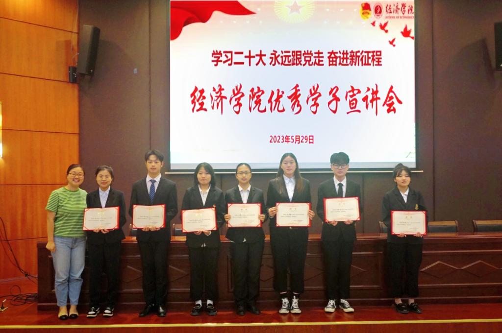 为学习宣传贯彻党的二十大精神,,激励2022级学子昂扬向上,鼓励同学们向榜样学习,奋进拼搏,将青春的朝气与理想融入时代浪潮,5月29日19点,K1体育分团委在江北校区宏智楼B509报告厅成功举办了“学习二十大,永远跟党走,奋进新征程”优秀学子宣讲会。本次“优秀经济学子”宣讲团由黄妍菲、费吉欢、李雅晴、秦梦莙、时梓玮、魏浩楠、方磬音、余明八位成员组成。