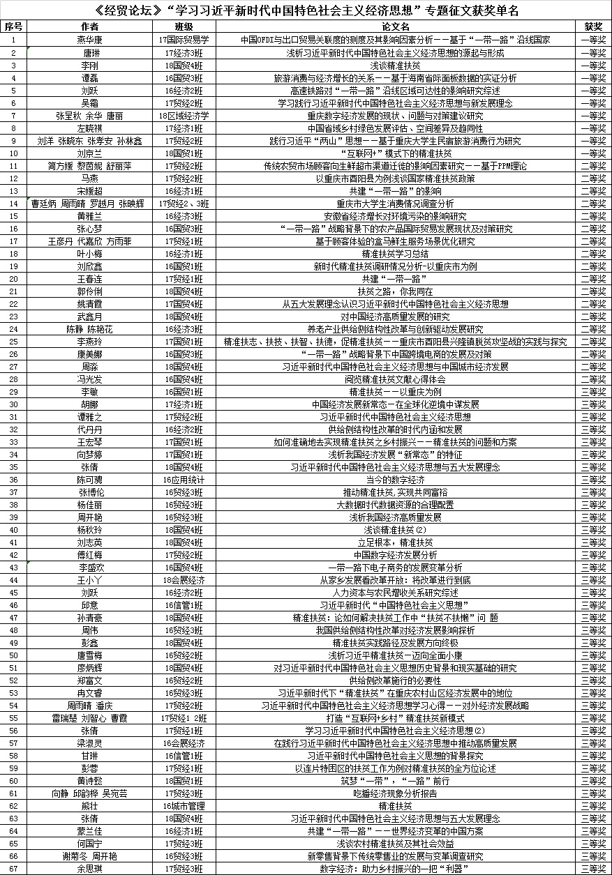 截止9月初,共收到稿件近70篇。投稿者紧扣中心、围绕主题,就精准扶贫、“一带一路”建设、五大发展理念、供给侧改革、数字经济、地方经济建设等多方面内容,阐述了自己的学术见解。经过公司专家组综合评定,遴选出优秀论文一等奖10名、二等奖18名、三等奖39名,获奖的优秀论文将被编入《经贸论坛(学习习近平新时代中国特色社会主义经济思想专刊)》。