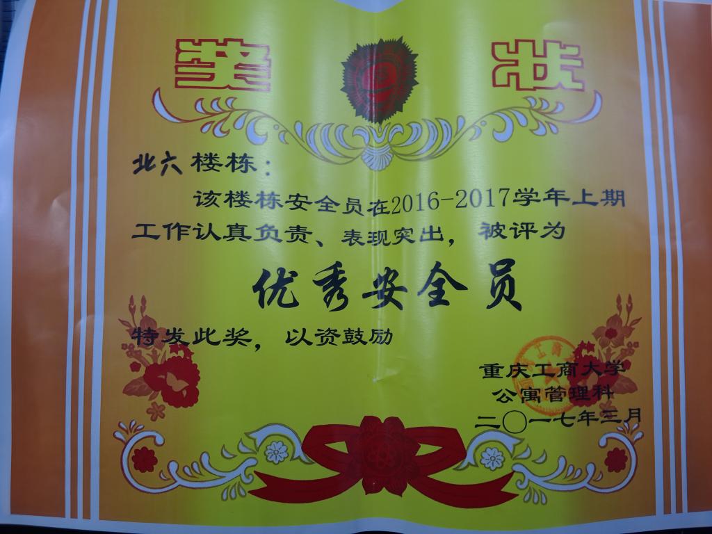 在开学第二周,公司完成了优秀安全员评选活动,全校共评选出5名优秀安全员,北六楼栋安全员以总分第二排名入列。北六栋的楼栋安全员在平时工作中积极认真负责,为楼栋的发展做出重大的贡献。这是公司楼栋管理的一项殊荣,也是公司对公司楼栋干部辛勤工作的肯定。