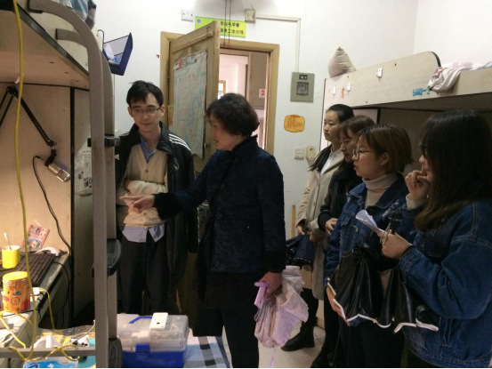 北区21栋是公司主管楼栋,也是全院男生集中住宿的楼栋。王书记、喻智成老师携公司女生楼栋干部代表一同对北21栋寝室进行了抽查。南区2栋住宿条件略差,集中住宿公司100多名女生,于书记携楼栋干部对该楼栋公司的21间寝室进行了逐一检查。
