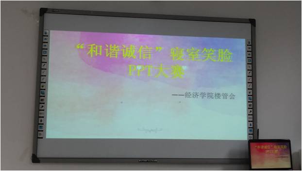 随着主持人宣布比赛正式开始,12位参赛选手个个意气风发,用文字、图片、音乐、视频等形式展示了各寝室的PPT作品。参赛的作品都别出心裁,图文并茂,有生活中的信任互助、有偶尔的误会摩擦、还有一起学习的充实快乐,每张PPT都记录了同学们学习生活的点点滴滴,充分体现了“和谐、诚信、微笑”的主题。