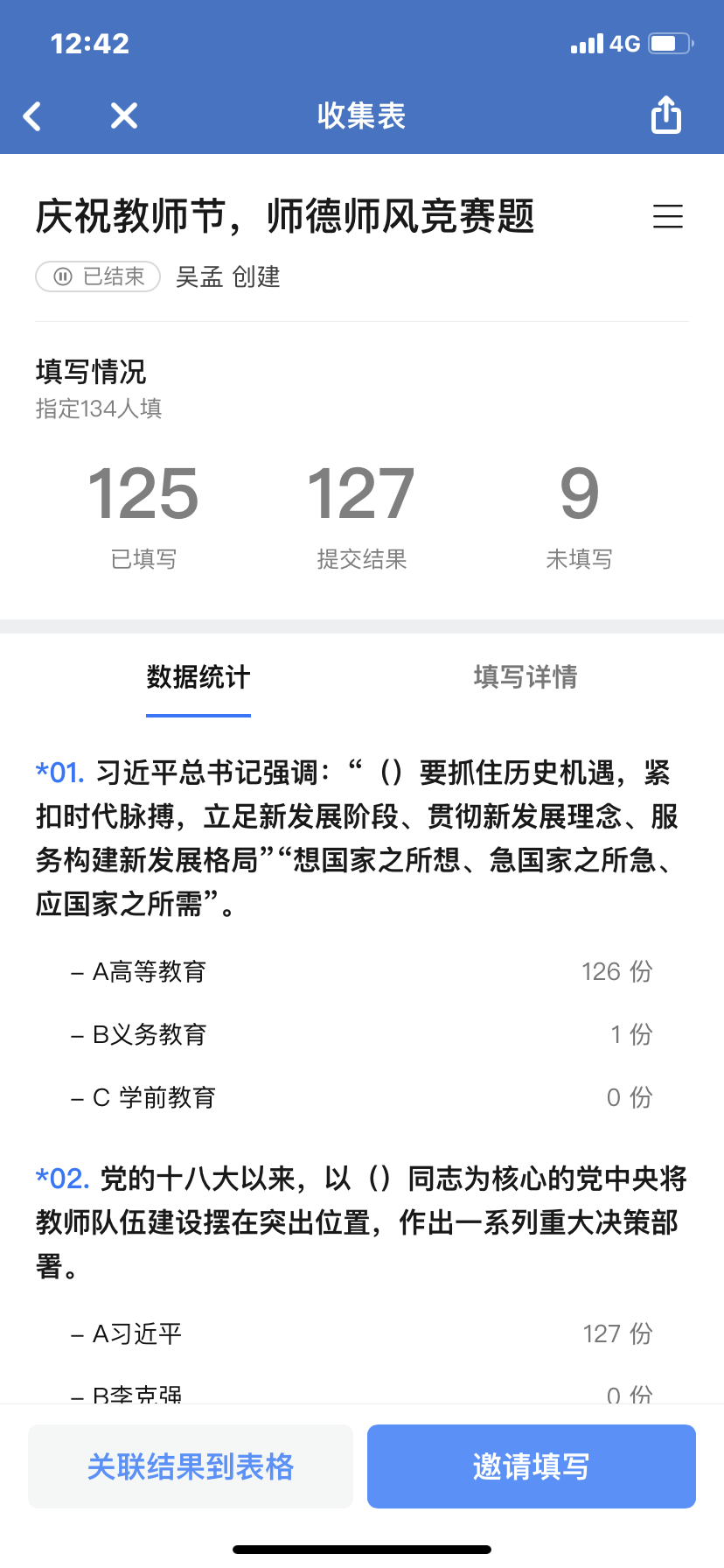 为庆祝第37个教师节,弘扬和推进师德师风建设,经济公司工会与2021年9月6日至9月10日,组织全院教职工进行了“庆祝教师节,弘扬师德师风”知识线上答题活动。本次知识竞赛,以习近平新时代教育改革发展思想为指导,紧紧围绕师德师风建设主题,从法律规定、政策制度、职业操守、价值导向等方面,精心设计了37个有关师德师风的知识问答题,也包含了庆祝第37个教师节的寓意。通过这样的答题活动,让老师们在教师节来临之际,重温了师德师风建设的有关规定和知识,为新的学期各项教学工作认真贯彻师德师风建设精神做好思想准备。本次知识竞赛答题活动,老师们积极踊跃参与,活动共收到全院125名教师的答题,公司工会以老师们的答题先后和对错率来评出一二三四等,发奖品,表达对老师们的节日问候。