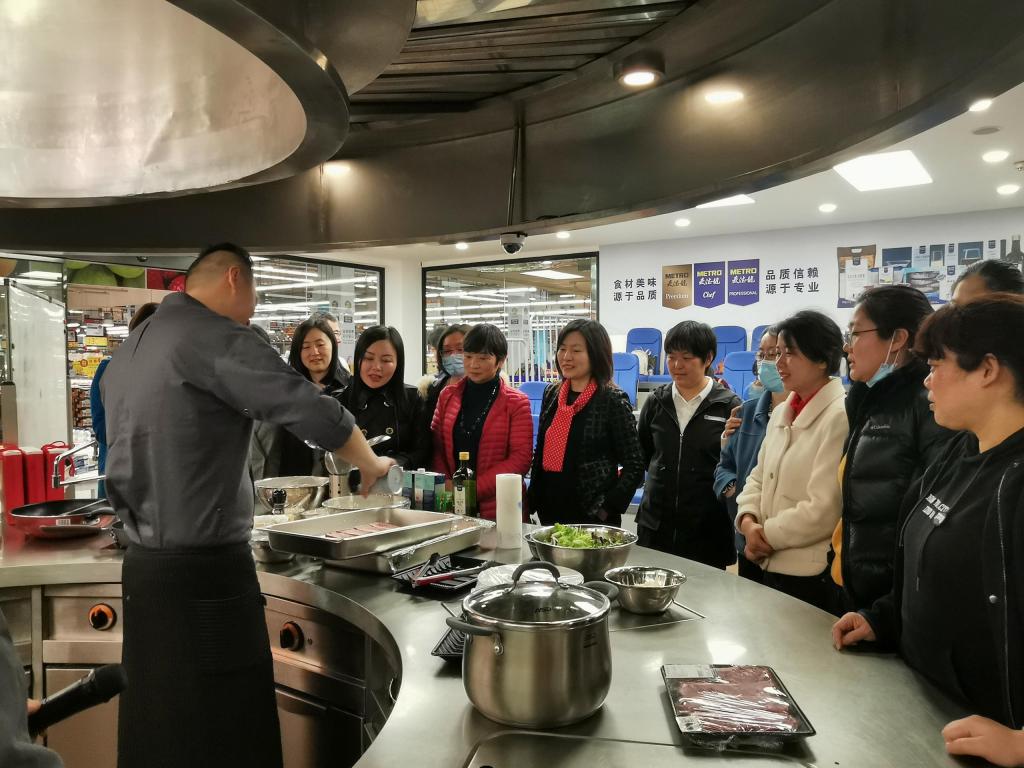活动邀请麦德龙餐饮公司戴大厨为大家进行指导。戴大厨通过讲解、提问、抢答等方式深入浅出地说明了西餐的原料、配料和烹饪注意事项,并现场依次示范了西冷牛排、罗宋汤、奶油意面的做法。随后,老师们在大厨指导和相互辅助下亲手烹饪了牛排和奶油意面,现场香气四溢、欢声笑语,厨艺得以提升,味蕾得以满足,团结得以彰显,有趣的学习方式得到了老师们的一致认可。