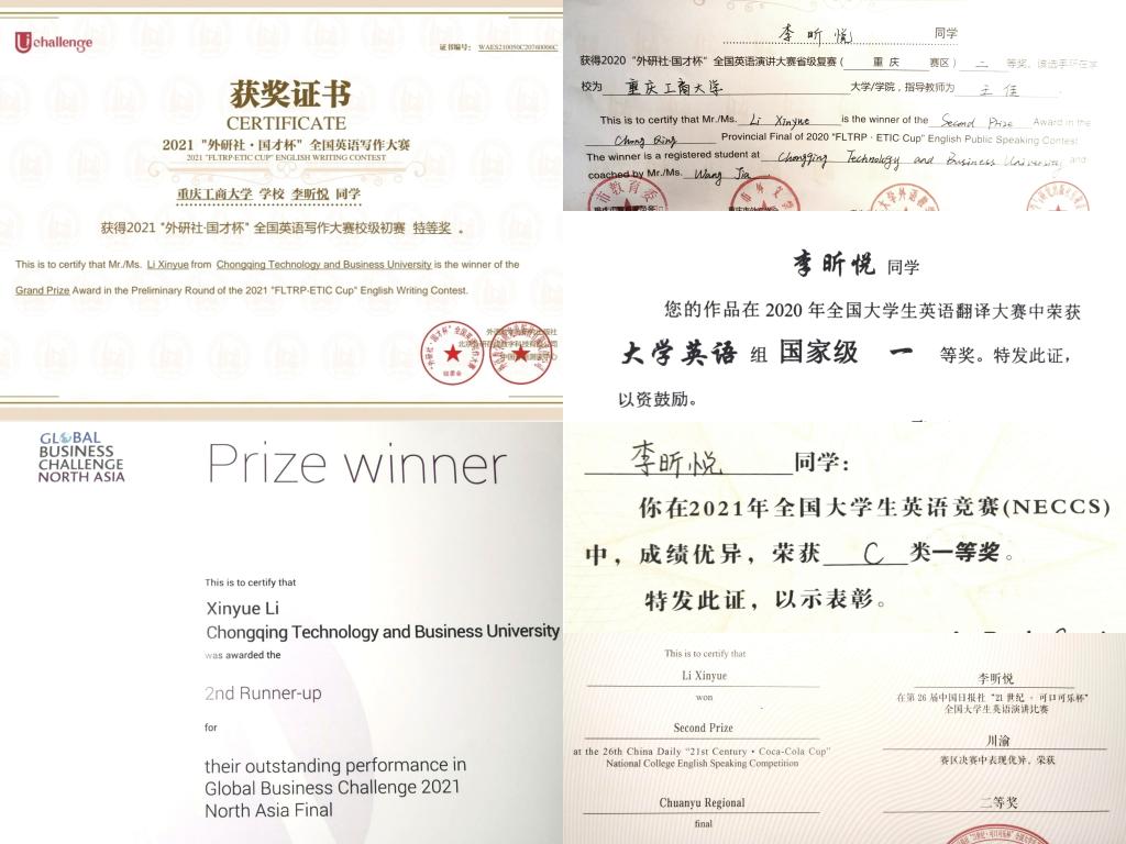获奖经历:2020年“外研社杯”英语演讲大赛校级一等奖、市级二等奖