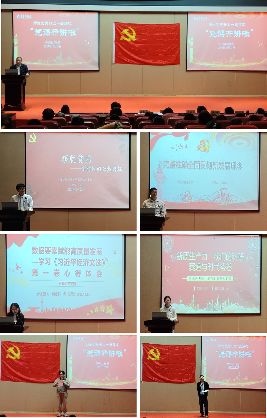 活动第二个环节为2025年下半年“党课开讲啦”活动,聚焦《习近平经济文选》第一卷,采用“员工党员主讲、教师党员点评”的形式开展。员工三支部党员王强以《摆脱贫困——新时代的必然选择》为题,生动讲述了党的十八大以来,党团结带领人民历史性解决绝对贫困问题的伟大实践,并阐释了共同富裕的时代内涵与实践路径。员工四支部党员扎西旺拉围绕《完整准确全面贯彻新发展理念》,阐述了全面贯彻新发展理念的重大意义、丰富内涵和时代要求。研究生三支部党员蒋依伶以《数据要素赋能高质量发展》为题,剖析了数据要素赋能高质量发展的内在逻辑,并强调了青年党员的使命担当。研究生四支部党员赵单以《新质生产力:我们的科研赛道与时代答卷》为题,聚焦新质生产力的实践要求,提出科学研究应紧密对接国家战略与经济社会发展需求,勇担使命、敢于创新。教工三支部黄潇教授在点评中指出,党课紧密契合国家战略与重庆实际,生动诠释了习近平经济思想的实践伟力,强调要自觉将习近平经济思想贯穿于服务民生、推动发展、科学研究的具体实践。教工四支部张充博士在点评中指出,新时代新征程上,要全面贯彻新发展理念,青年党员要勇担使命,奔赴祖国最需要的地方,将论文写在中国大地上,为实现民族复兴伟业贡献青春力量。