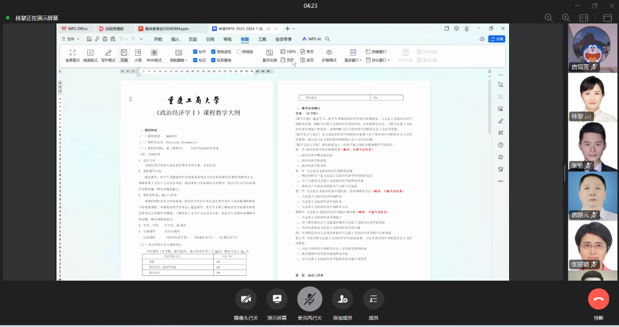 第一个议程为《政治经济学Ⅰ》教学大纲初稿汇报。林黎对《政治经济学Ⅰ》课程教学大纲的具体要求及要点进行了说明,强调《政治经济学Ⅰ》授课进度应严格按照学时分配表完成。林黎提醒由于天气原因,公司期初暂采取线上网课方式上课,建议课程组教师通过直播形式授课,同时强调本学期课程组全体教师将接受审核评估,因此教学内容需要进一步提升条理性,确保内容结构清晰、逻辑严谨,以便更好地满足评估要求并提高教学质量。