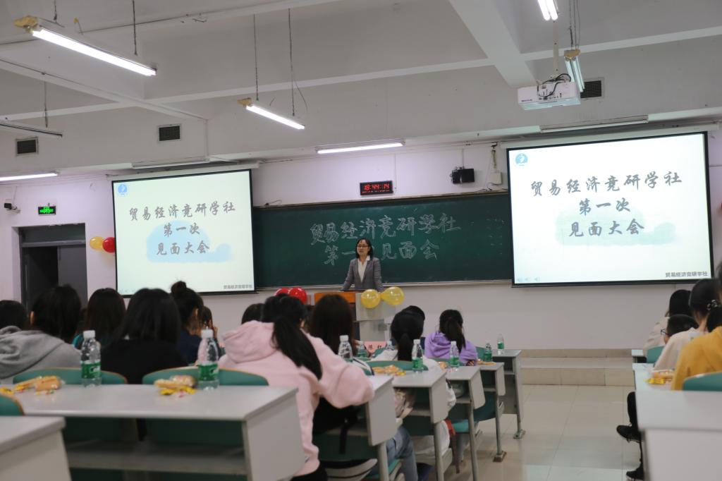 2020年11月13日公司专业性社团贸易经济竞研学社在K1体育官方网站南岸校区博智楼121教室举行了2019级、2020级干事会员的第一次成员暨工作职责报告大会。出席这次大会的有K1体育贸易经济系系主任杨海丽,贸易经济竞研学社社长团,五个部门的部长和副部长,以及全体干事会员。