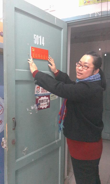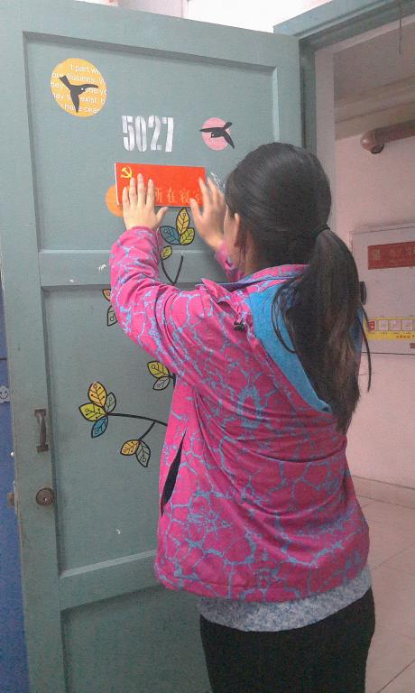 楼栋奖牌挂完后,在郝颖老师的带领下,进行了党员所在寝室挂牌。在挂牌中,党员及其室友都为之感到骄傲与自豪,自信的笑容展现在她们的脸上。将印有党员所在寝室的牌子贴在员工党员所在寝室的门上,每位党员首先要带领本寝室成员搞好寝室文化与学风建设,其次是要带领周边寝室进行良好的寝室学风建设。