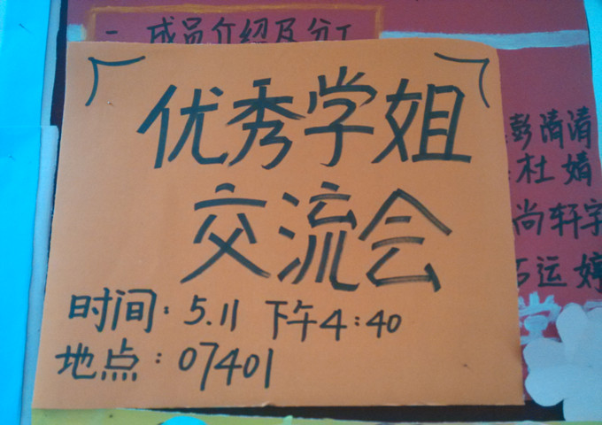 2015年5月11日下午4点半,由北六党服和北六楼栋,北二十一党服联合举办的优秀毕业生分享会在7401教室顺利举办,5位2011级优秀学姐到场分享了关于考研学习以及工作等各方面的经验。
