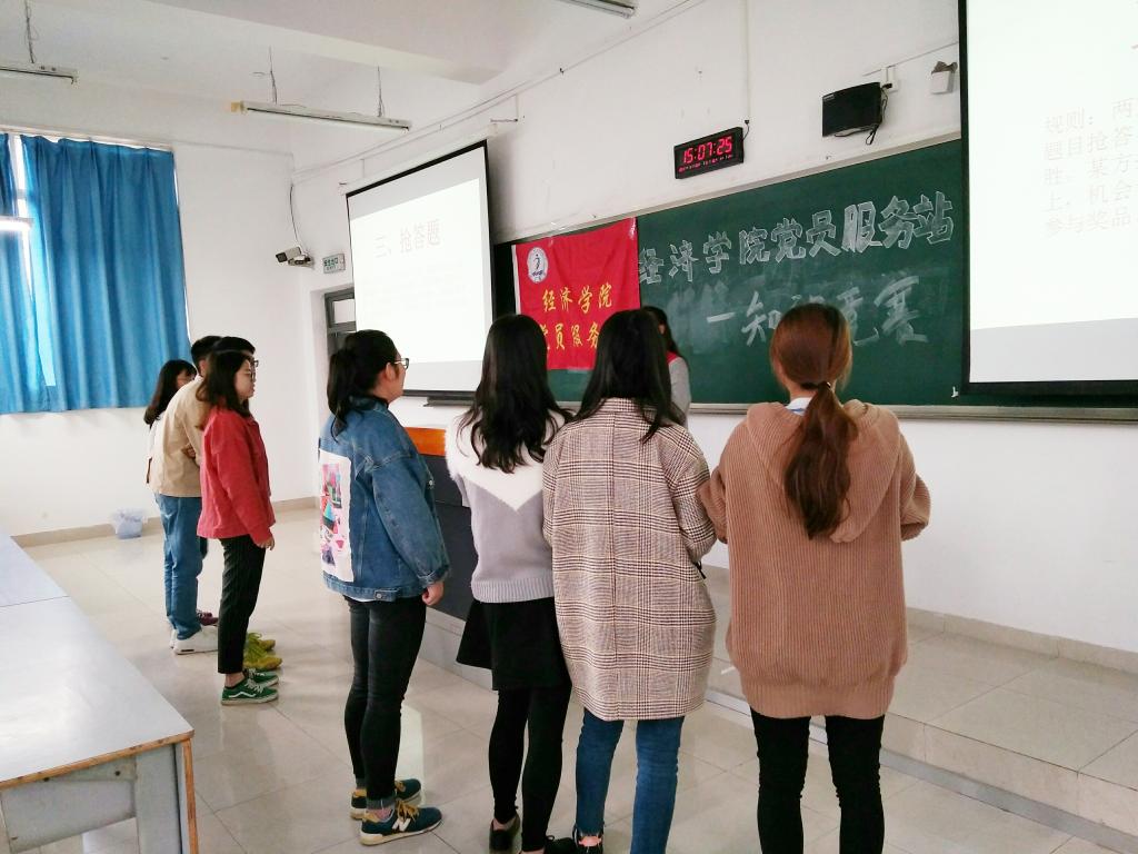 接着,活动的第一个环节:邀请了八个站员随机组成两个四人小组进行按顺次答题。在主持人的号召下,站员们踊跃举手,形成的两个小组之间竞争十分激烈,台下的其他站员们都热情地为他们鼓掌。然后是个人抢答环节,现场的气氛越发热烈,诸位站员们积极参与,而且百战百胜,以一种更生动更形象的方式传播着十九大的知识与精神。最后,主持人总结了此次活动的意义并对站员们的积极参与表示衷心地感谢。