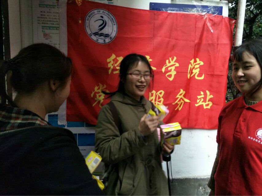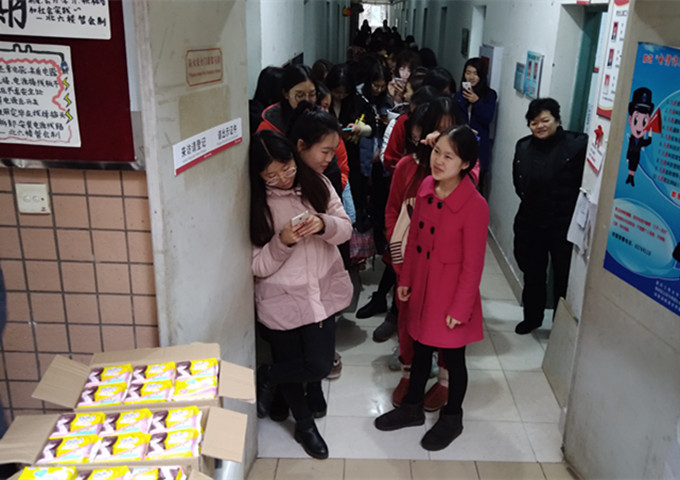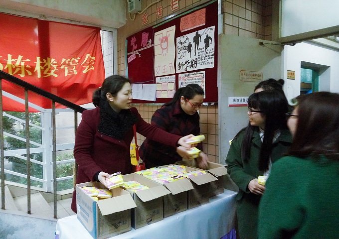 3月7日中午,在北十五和南二楼栋负责分发礼品的娄方亭,罗婉菱,敖倩,徐翠等几位党员服务站的部长早已将礼品准备好,分给路过的同学们。下课回来收到礼物的同学难掩惊喜,纷纷表达了感谢之情,大家热情高涨,活动在欢乐的氛围中顺利进行,并且党员服务站的部长们与同学们和宿管阿姨一起留下了亲密合影。对北六栋女生们的慰问行动也于当天下午4点在北六栋门口进行,由公司党总支于频副书记和郝颖老师亲自到场为同学们进行了礼物发放,到此本次女生节送温暖活动就圆满结束了。
