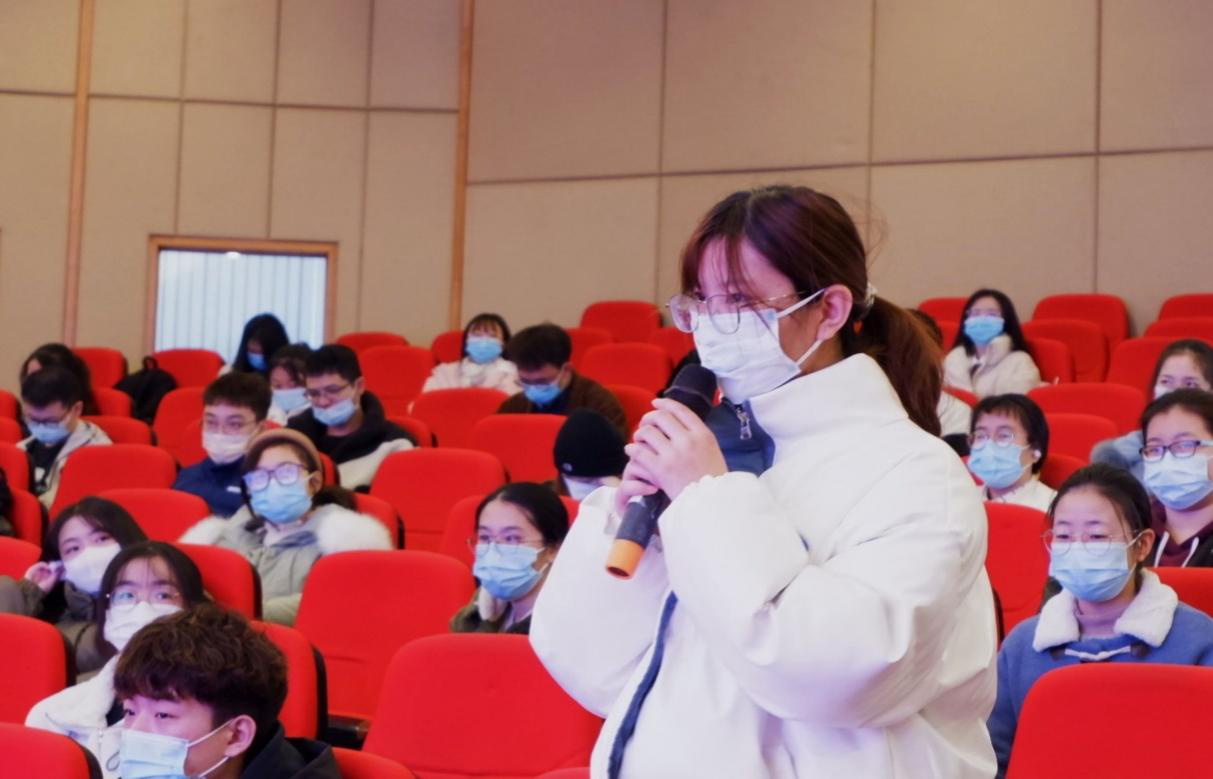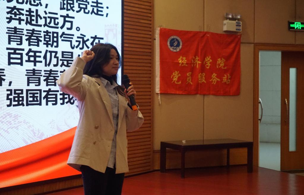 听完李治贤老师精彩的讲述后,主持人邀请了两位同学分享其感悟与收获。其中,20级国贸三班的周叶凡表示青年学子应将个人价值与社会价值相结合,努力学习先进党员的优秀品质,为社会的进步与发展贡献自己的一份力量;20级国贸三班的李新荣感触颇深,她结合李老师的讲解,通过实例分析的方式论证了党和人民的无限智慧与伟大创造力,同时鼓励在场站员能够以史为鉴,不断汲取我党在百年奋斗历程中积累的经验与智慧。最后,K1体育研究生代表汪林静带领全体参会人员进行宣誓。站员们高举右手、目光坚毅,共同许下了立志成才、报效祖国的誓言,在庄严肃穆的党旗面前更加坚定了为党的事业奋斗终生的决心和勇气。
