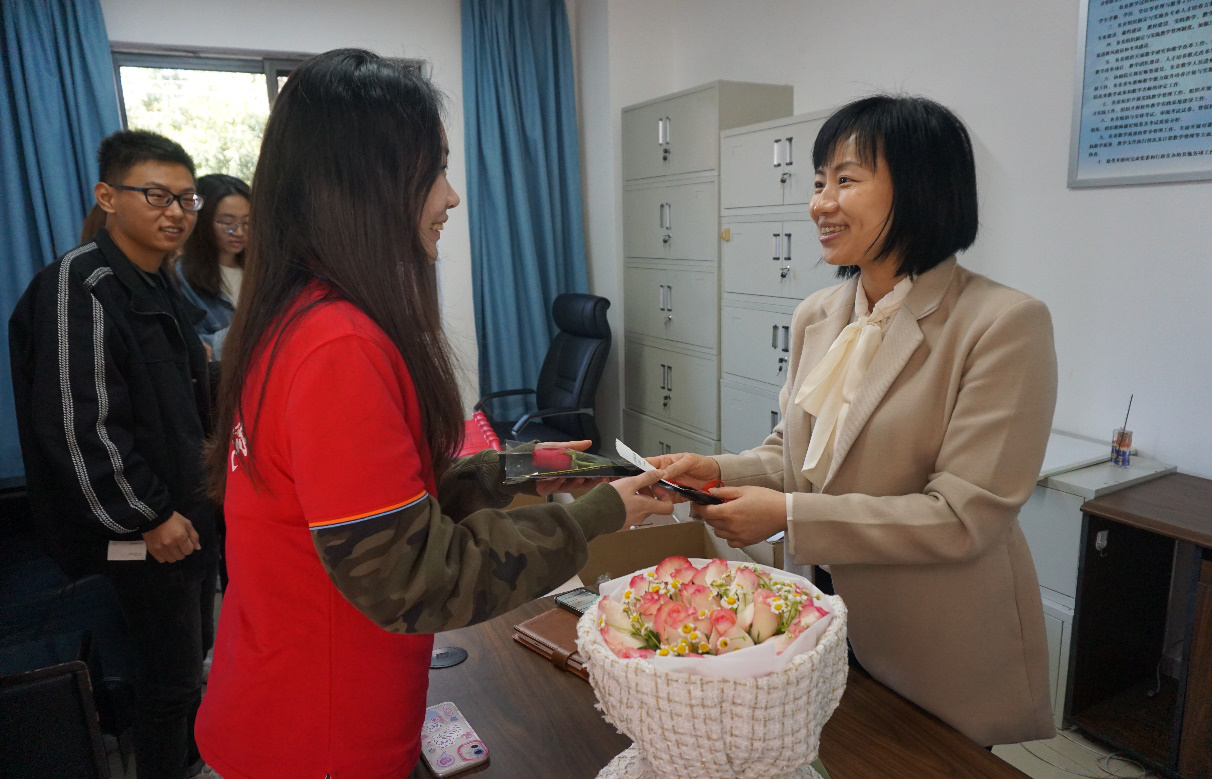 (图为党服站员为公司领导和老师们送上鲜花与祝福,张子璇摄)