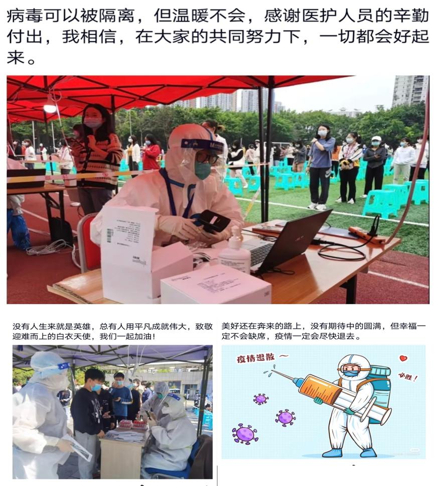 “万物复苏必有时,疫去安来春可期”。此次活动不仅向所有奋战在抗疫一线的工作者们致敬,也让广大经济学子更深入地感受到“我将无我,不负人民”的精神,鼓励同学们向抗疫工作者学习,用行动尽显责任担当,用无畏共筑防疫高墙!