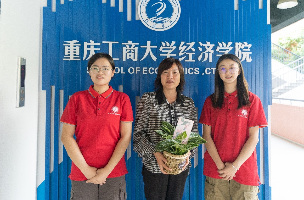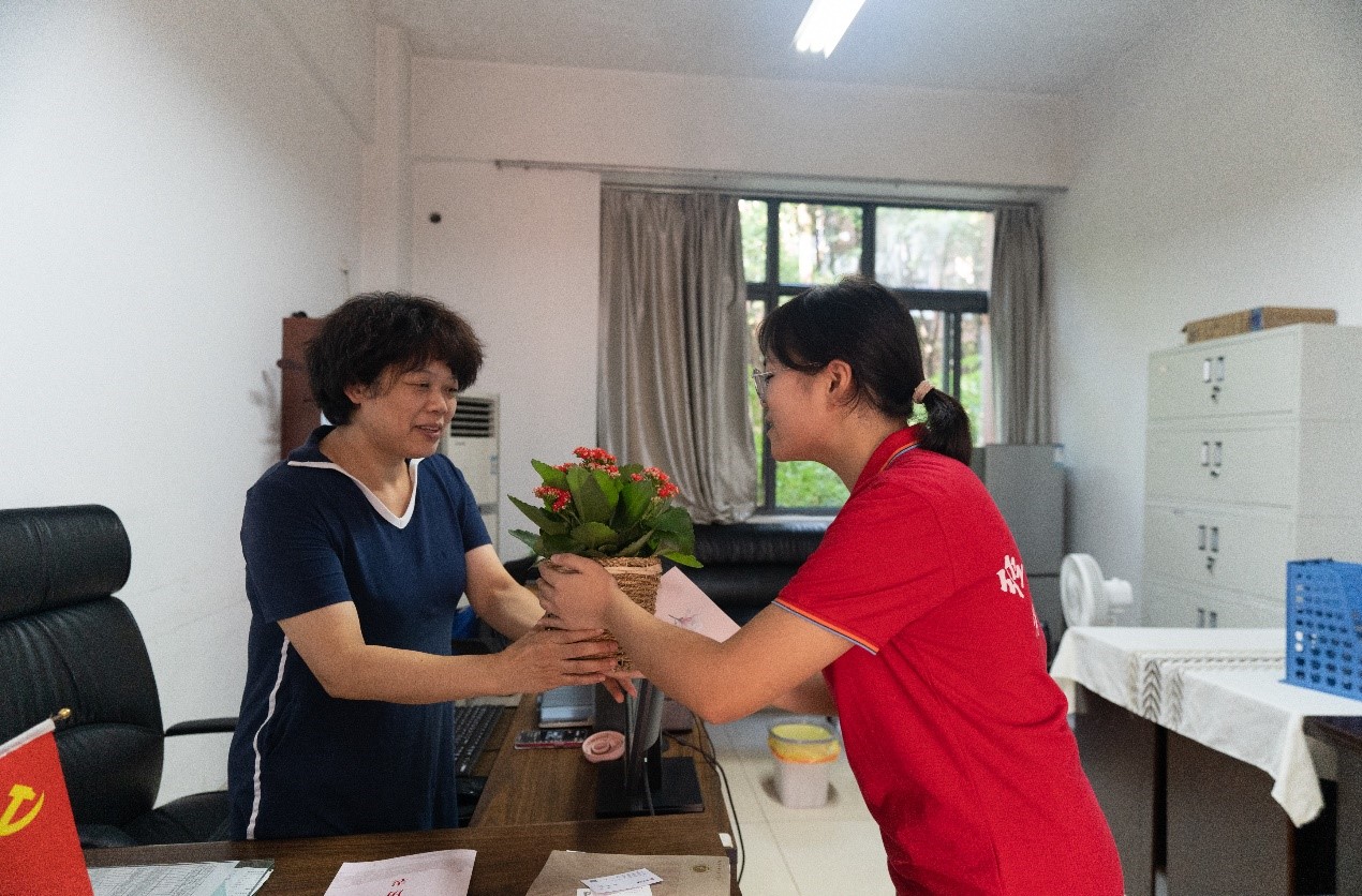 (图为经济党服成员为公司领导和老师们送上鲜花与祝福,邓彬悦摄)