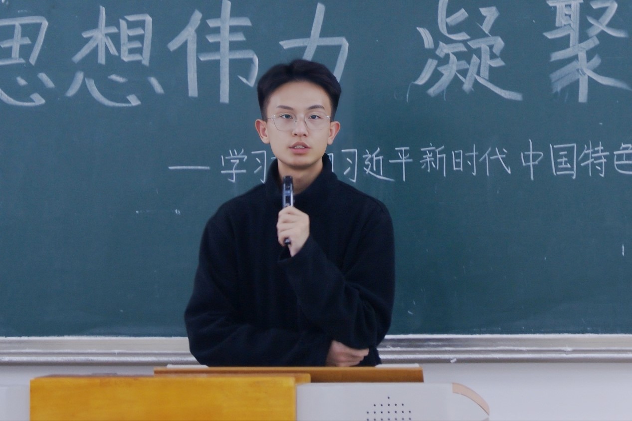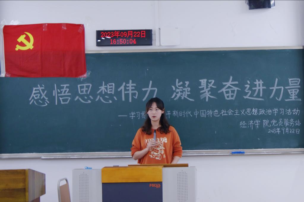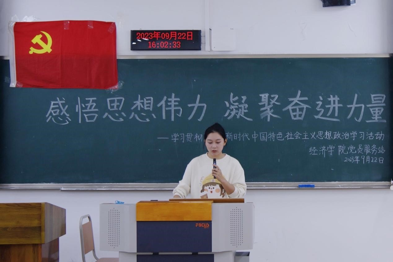 活动前期,参与活动的成员被平均分为八个小组,各小组明确分工、一同学习,共同将学习成果转化为将在活动现场展示的ppt。下午16时, 随着暖场音乐的响起,站员有序落座,主持人简单介绍活动背景与规则后,宣布活动正式开始,各小组代表依次上台分享本小组的学习成果。其中,20贸经三班程聖泥同学另辟蹊径,以习近平新时代中国特色社会主义思想中的经济思想为切入口,向活动观众介绍了新时代经济走向高质量发展的趋势,同时也提到中国的社会主义市场经济体制在当前充满变化的世界背景下对于应对经济风险独特优势。随后,22税收一班肖艳同学提到,习近平新时代中国特色社会主义思想在推进新时代中国特色社会主义伟大实践中展现了强大力量,是新时代党和国家事业发展的根本遵循,对推进中华民族伟大复兴历史进程具有重要意义。各小组分享完毕后,主持人总结致辞,宣布活动圆满结束。