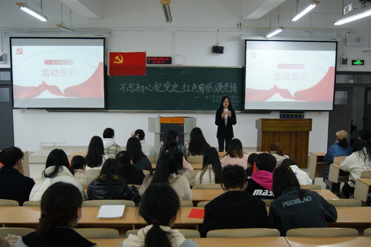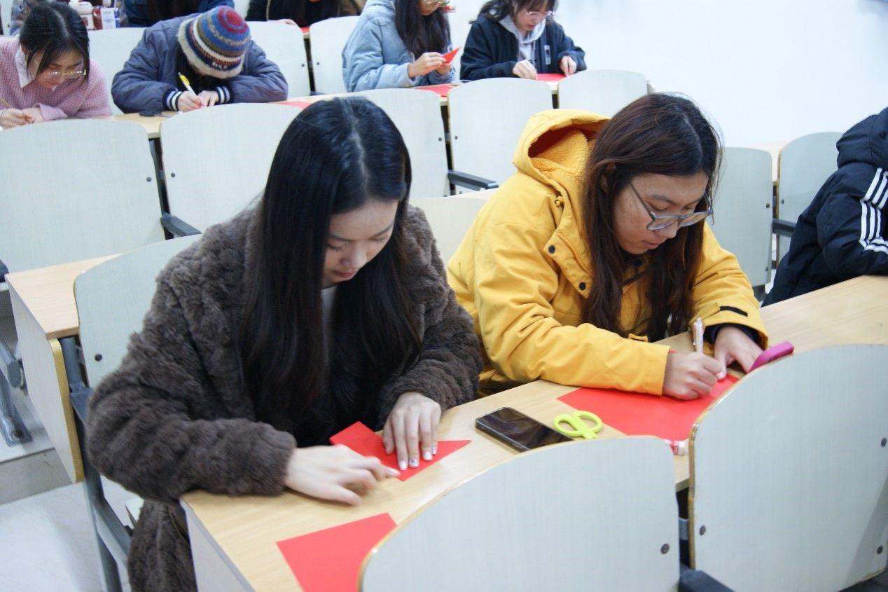 下午15时,活动正式开始。主持人22国贸二班康欣同学向站员介绍中国剪纸艺术源远流长的历史背景和其承载的丰富的文化内涵。随后,进入30分钟自由剪纸创作环节。同学们聚精会神,细腻的笔触下生动的形象跃然纸上,灵巧的双手中精美的图案雏形渐显。铅笔一笔笔勾勒,描出浓厚党情的轮廓;剪刀一次次落下,裁出红色精神的模样。