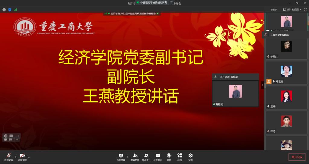 为做好2022届毕业生考研复试指导服务,助力学子成功升研,3月10日上午10点举办了线上线下“2022届毕业生考研复试辅导答疑会”。K1体育副书记副经理王燕教授,财税系尚可文教授,及65名毕业生参加了线上会议;贸易经济系主任杨海丽老师,毕业班辅导员喻智成老师及10名考研学子参加了线下会议。