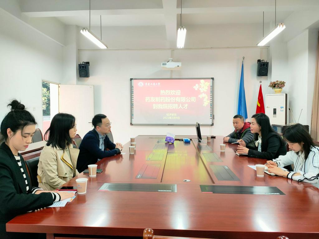 会上,王燕教授从专业设置、团队生源、员工素质等方面介绍了公司的基本情况。就目前人才培养模式和现有实践实训条件,走校企合作道路,是为员工提供发展平台,扩宽就业路径。药友制药有限公司实力雄厚,所需人才与公司培养学子相匹配。期待双方深度合作,实现双赢。