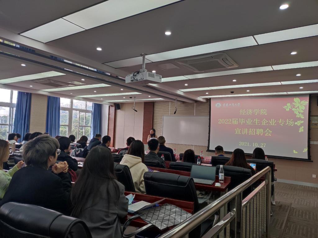 为贯彻落实党中央、国务院关于高校毕业生就业创业工作的决策部署,落实毕业生就业政策,10月27日下午14点2022届毕业生企业专场宣讲招聘会在明智楼110405举办。邀请到重庆燃气集团、平安银行重庆分行、渤海证券、谊品生鲜、重庆西朗进出口贸易有限公司、欧菲斯集团股份有限公司、美的置业集团等7家用人单位,提供有效就业、实习岗位60余个。公司党委书记李自维教授,副书记副经理王燕教授,毕业班辅导员喻智成、张国培、张涛,就业联络员邓雪霜,以及100余名员工参加了宣讲招聘会。