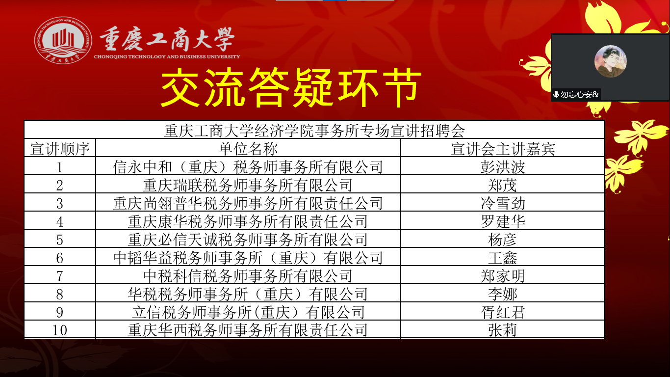 最后,员工互动发言。多位毕业生同学从工作经历、项目经验、具备条件、是否需要考取相关证书等方面进行提问。招聘单位领导从“会观察、爱思考、会学习”等方面明确了招聘人才的关注点,为同学了明确了未来努力的方向。本次“云宣讲”历时近两小时,为公司员工搭建了良好的就业平台,通过互动,增进了同学们对各税务师事务所的深入了解,截止目前已经收到投递给事务所的简历近70余份。招聘会取得了圆满成功。