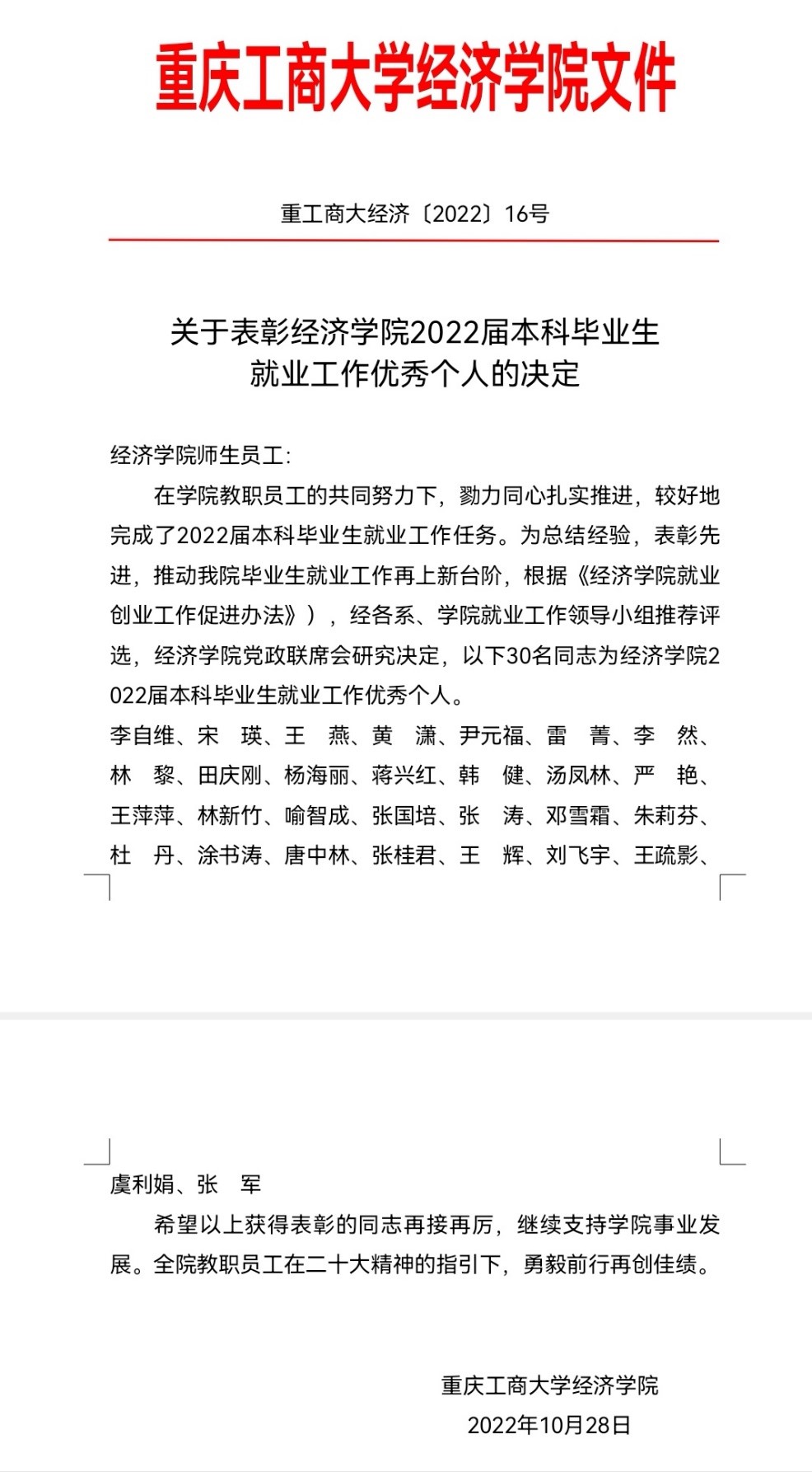 李自维书记宣读了关于表彰2022届本科毕业生就业工作优秀个人的决定。先进个人代表贸易经济系主任杨海丽、应用经济系教师杜丹、2022届辅导员喻智成作了交流发言。
