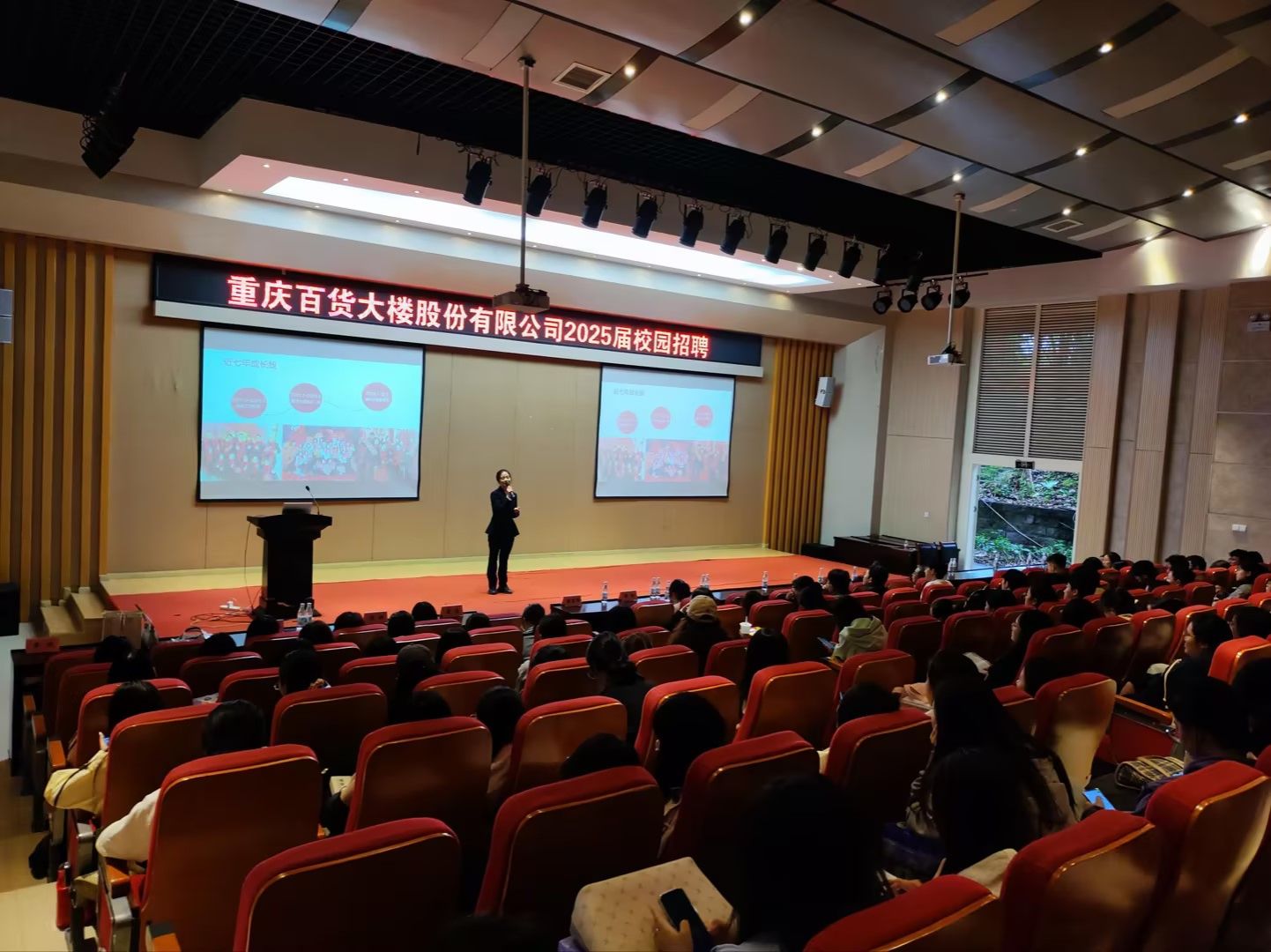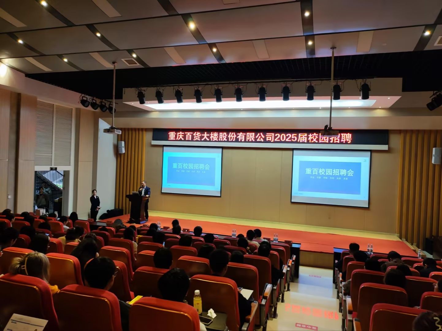宣讲会上,重庆百货大楼股份有限公司人力资源总监张泽军从公司发展历程,四大业态的经营现状,公司的培养育人计划,人才晋升通道,福利待遇等方面进行了讲解。他表示重百非常重视员工的培养,鼓励老员工积极尝试。