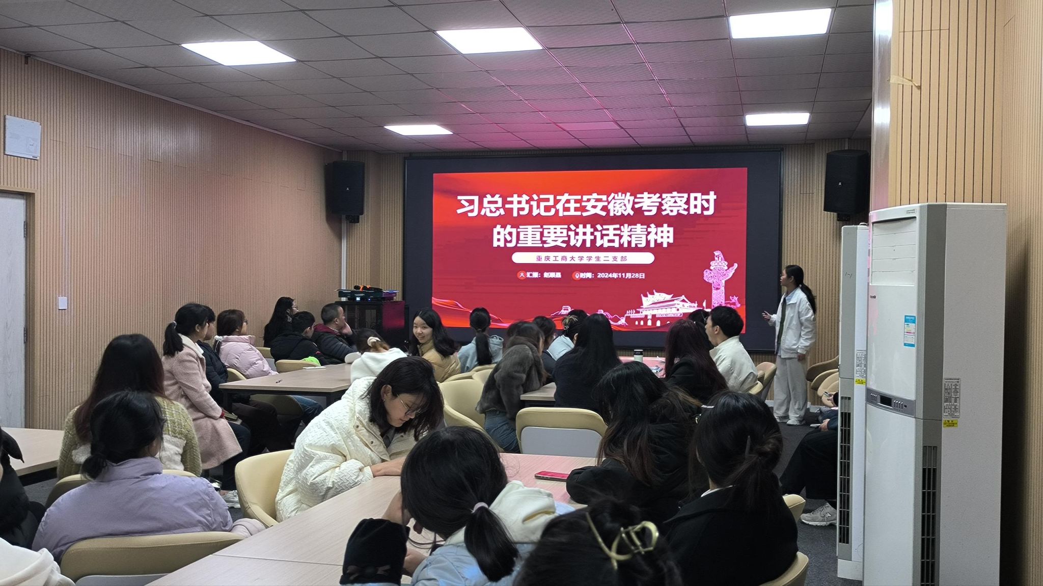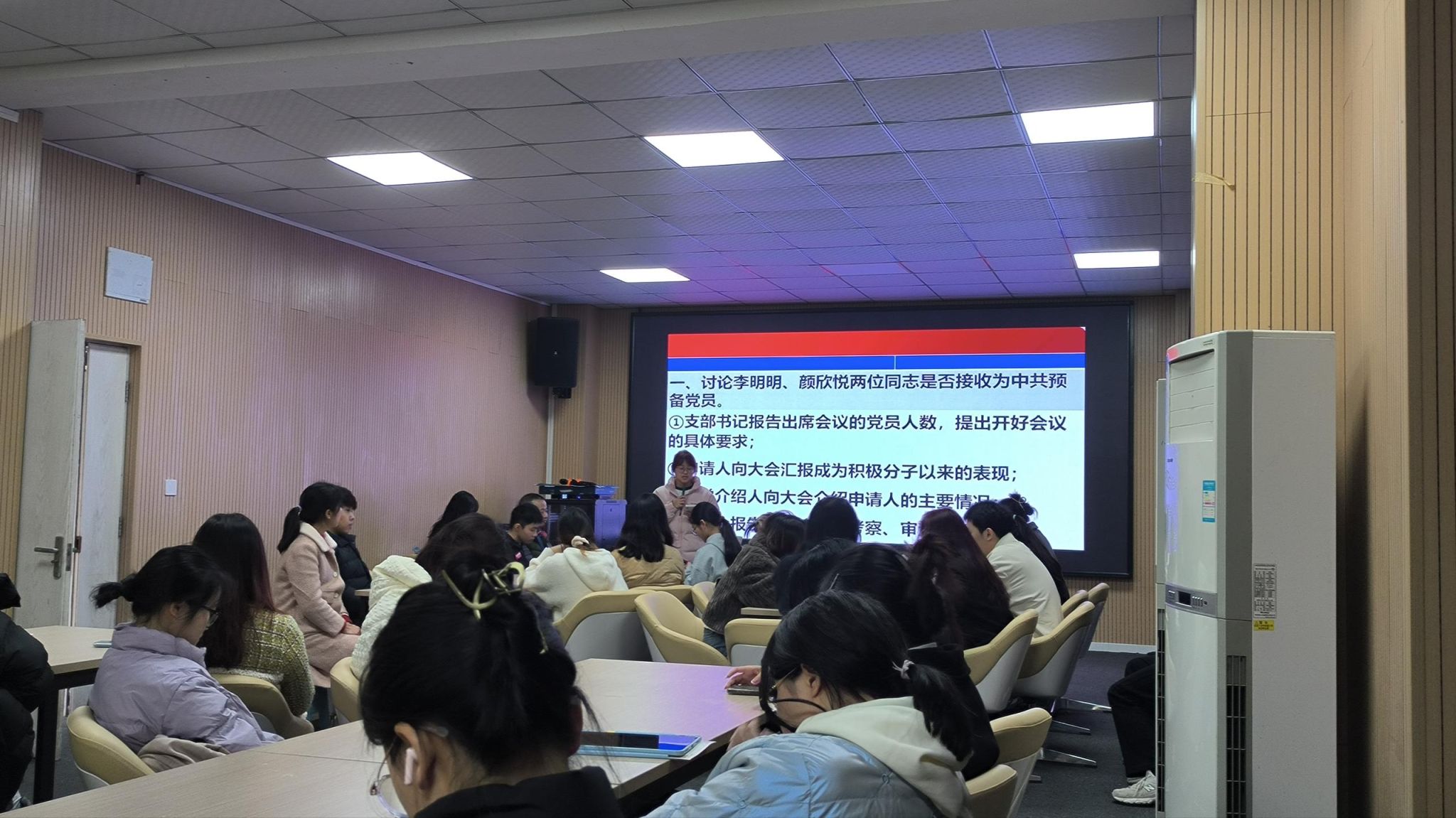 按照活动安排,对照党员发展程序,大会依次对李明明和颜欣悦两位发展对象吸收为中共预备党员进行了讨论、审议和票决,一致同意两位同学发展入党。依照党员转正程序,大会依次对彭燕芳、蒋瑶、郭静跃、何渤杰、董娜五位预备党员按期转正进行讨论、审议、票决,一致同意五位同学按期转正。支部党员赵顺晶、徐睿、严镔莹、李晋丞、周春燕、张凯璇对11月份组织生活学习内容进行了领学和交流。