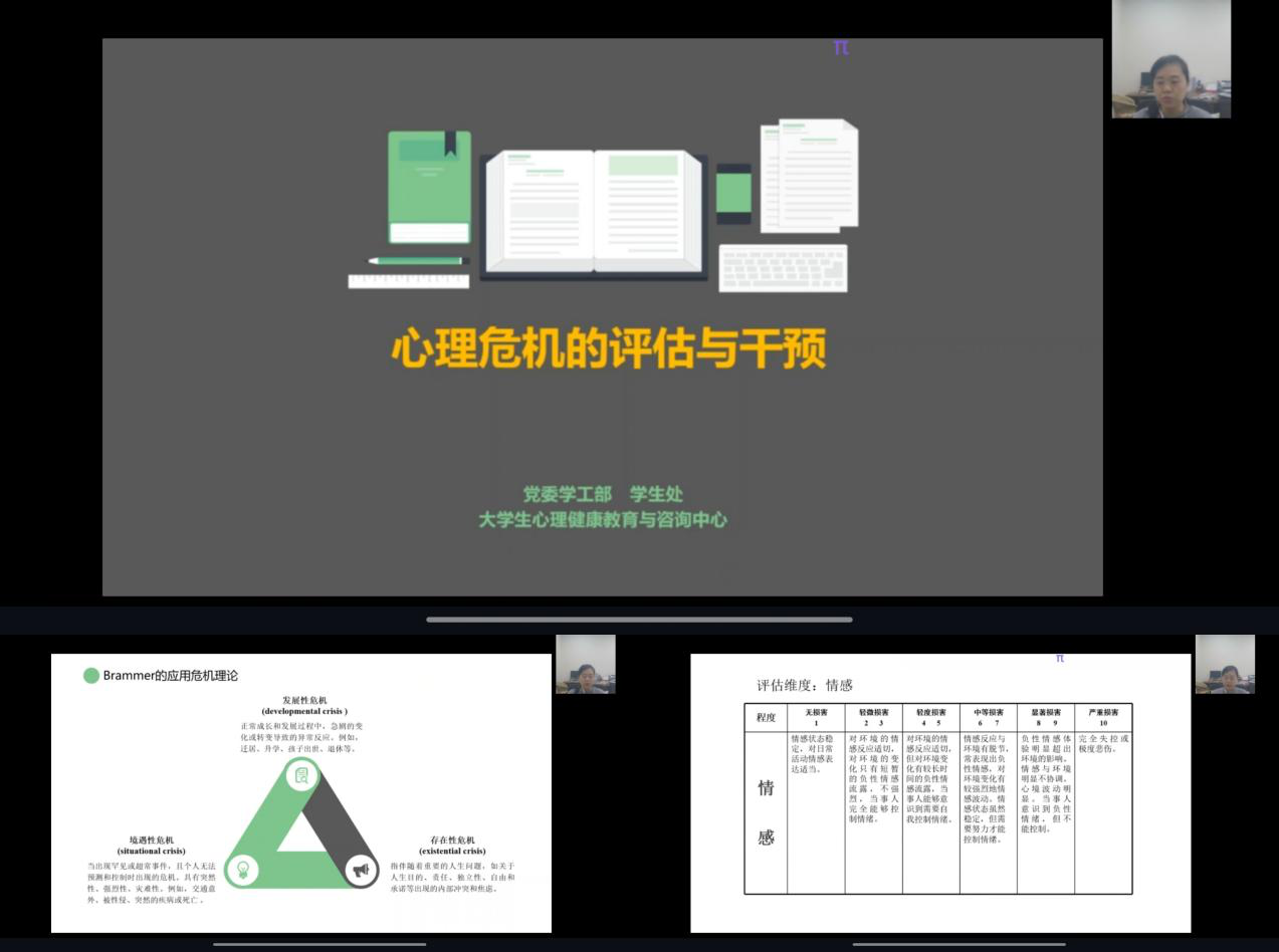 胡佳怡老师主要先从危机的概念讲解,并为同学们拓展了境遇性、发展性、存在性这三类危机的知识。她强调各位心理委员和寝室长应从情感、认知、行为等生理状况来对同学们的心理危机状态进行评估,针对不同的心理评估分数,同学们应分别进行不同层级的干预,以及了解作为帮助者应该思考哪些方面的问题。