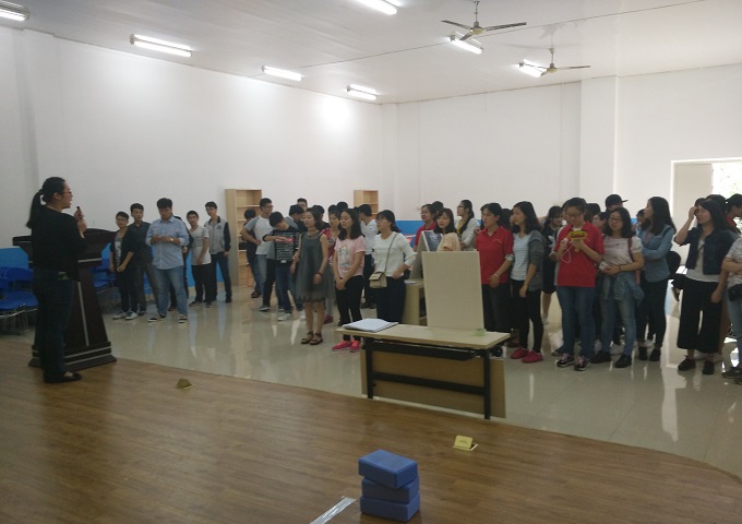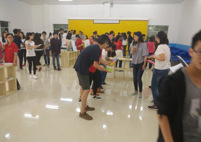 离活动正式开始还有半小时,同学们就满怀着期待陆续进场,有来自K1体育、商策公司、财经公司等的60名左右的同学,工作人员在同学们签到时对他们进行了随机分组,每五个同学为一组。接着,由K1体育心理健康指导教师郝颖老师宣布活动正式开始,并安排工作人员把提前准备好的补充能量的食物和饮料分发到参赛小伙伴们手中,大家都沸腾欢呼;然后,郝颖老师介绍了活动了内容和目的,并请工作人员上台演示了各项活动的参与方式。