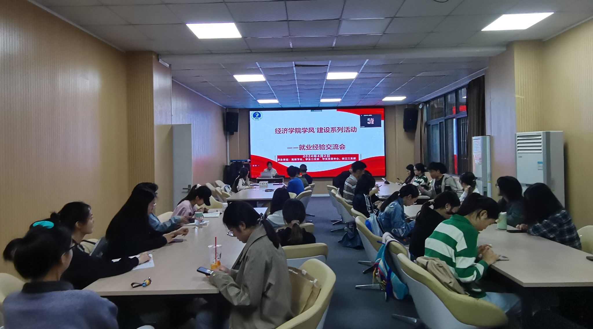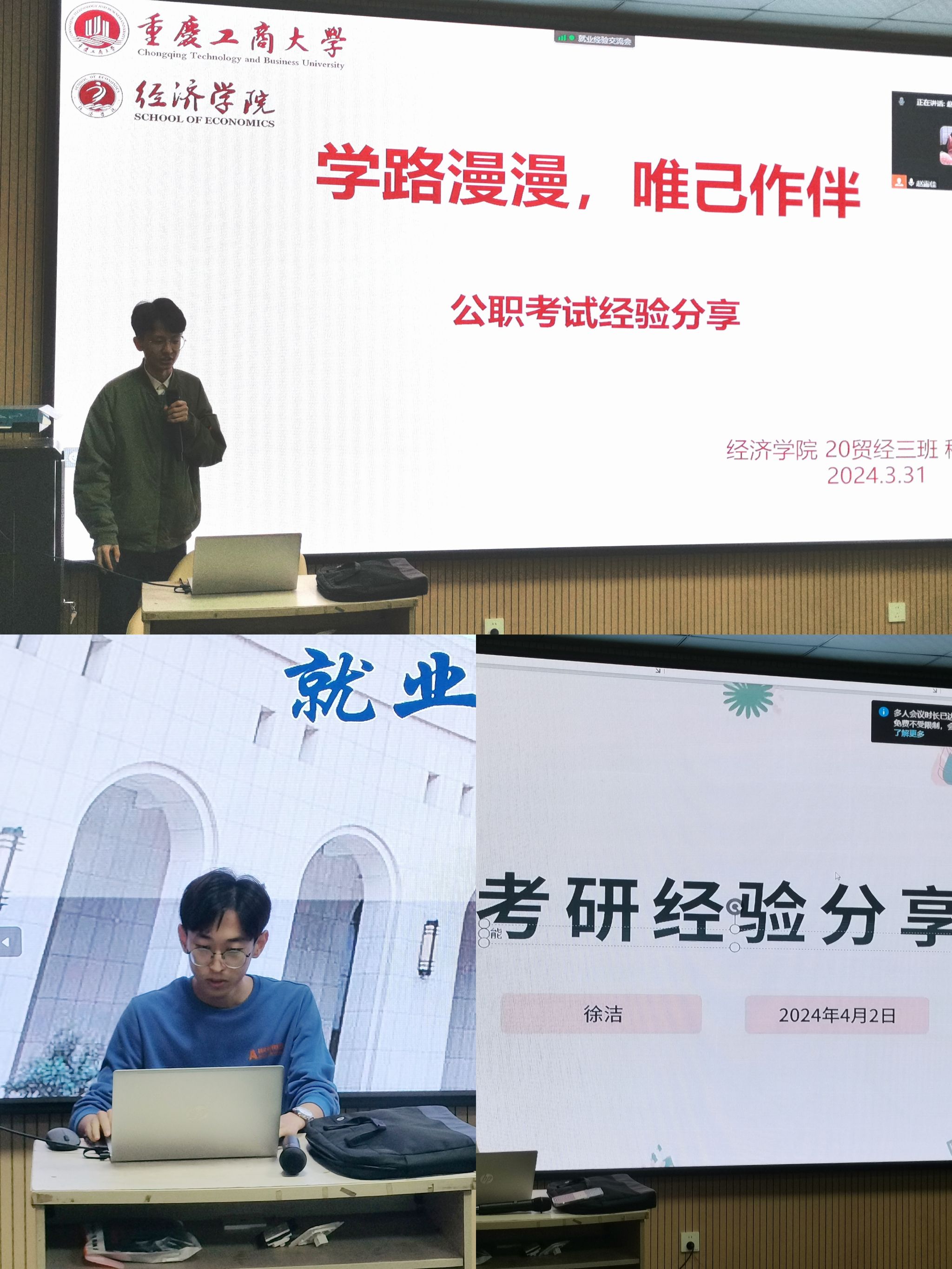 随后,六位学长学姐针对自己的就业方向进行了细致的分享。在就业方面,雷茜和李昊两位同学以自己应聘的银行岗位为例,从报名方式、简历撰写、考试准备几个方面向大家介绍了这个岗位的相关知识,让同学们对银行的相关岗位有了更加充分的认识。在考研方面,徐洁和李思炜两位同学分别阐述了各个考研科目的前期准备,从时间线方面向大家详细列举了备考的方式。同时分享了很多学习的渠道,为有考研想法的同学提供了更多的帮助和思路。在考公方面,程聖泥和李浩两位同学就考公的基本情况,国考、省考、选调和事业编几个类型考试的相关知识以及前期准备作了详细的介绍,让同学们对公务员考试的内容有了更充分的了解。六位同学都针对自己的就业方面向同学们进行了分享,令大家收获颇丰。