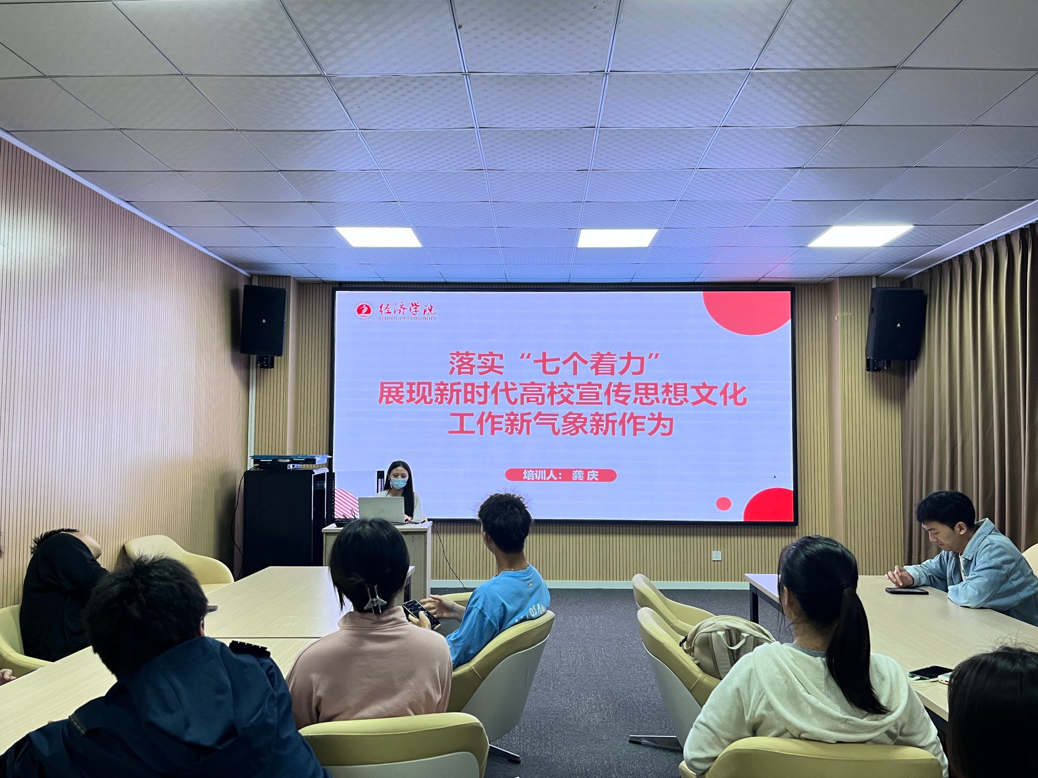 培训会议开始后,组织负责人黎亚男同学以“成渝地区双城经济圈建设”为主题展开培训。她分享到,作为经院学子,我们要密切关注经济热点,拓宽自身学习视野,丰富自身所学。随后,组织负责人何渤杰同学就“总体国家安全观”主题对参会人员展开了相关培训。通过对总体国家安全观的核心要义和“十点坚持”的阐述,他向我们进一步普及了坚持国家总体安全观的重要性,呼吁我们员工干部要坚定自身信念,树立崇高理想,不断为中华民族的伟大复兴贡献青春力量。紧接着,组织负责人皮薏暄同学从“树立正确的就业观、择业观”进行了就业技巧分享。她结合切身经历与对外了解,对参会人员提供了相关就业建议与指导,鼓励同学们保持学习热情,争取在老员工活中参与各类实践活动,积累工作经验。