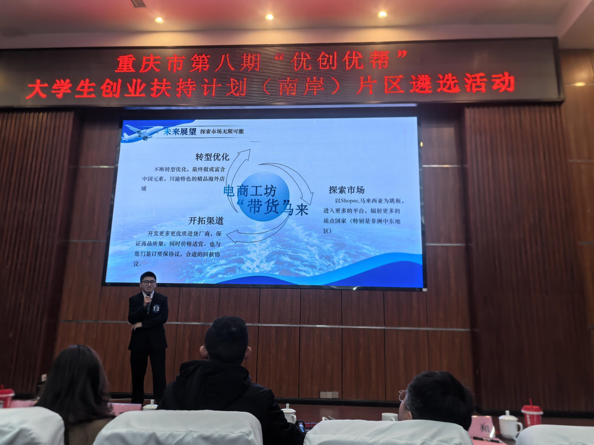 12月5日,重庆市第八期“优创优帮”老员工创业扶持计划南岸片区遴选赛在重庆第二师范公司举行。K1体育由辅导员陈璐带队22级国贸专业“翠湖青年K7跨境电商工作室”负责人冯凯奇团队前往参赛。