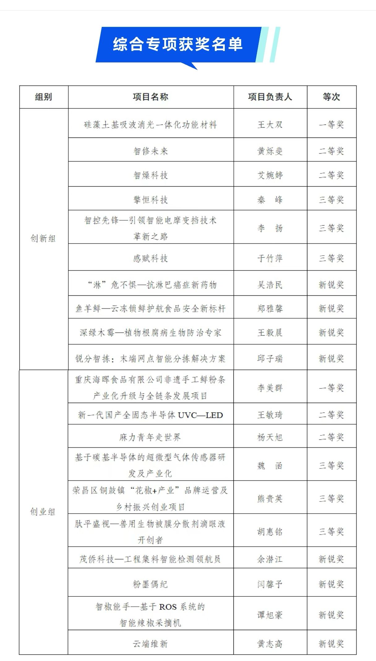 9月23—24日,由共青团重庆市委、重庆市科技局、市经济信息委、市人力社保局、市农业农村委、市商务委、荣昌区政府等单位联合主办的2025年重庆青年“创青春”大赛(综合专项)决赛在重庆市荣昌区举办。共青团重庆市委副书记黄宗华、荣昌区政府副区长谢勇出席活动并为获奖项目颁奖。