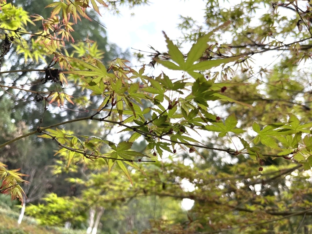鸡爪槭的美,藏在四季的时序更迭里,春发新叶,夏孕花蕊,秋染丹红。春日里,鸡爪槭抽芽展叶,新叶黄绿相间,嫩态盈盈,为校园添上一抹清新的绿意;初夏时节,枝头会悄悄长出淡紫色的小花苞,花苞小巧低调,不惹眼目,整株树木看似普通,却在默默酝酿着秋日的惊艳,也为结出独特的翅果做好准备。