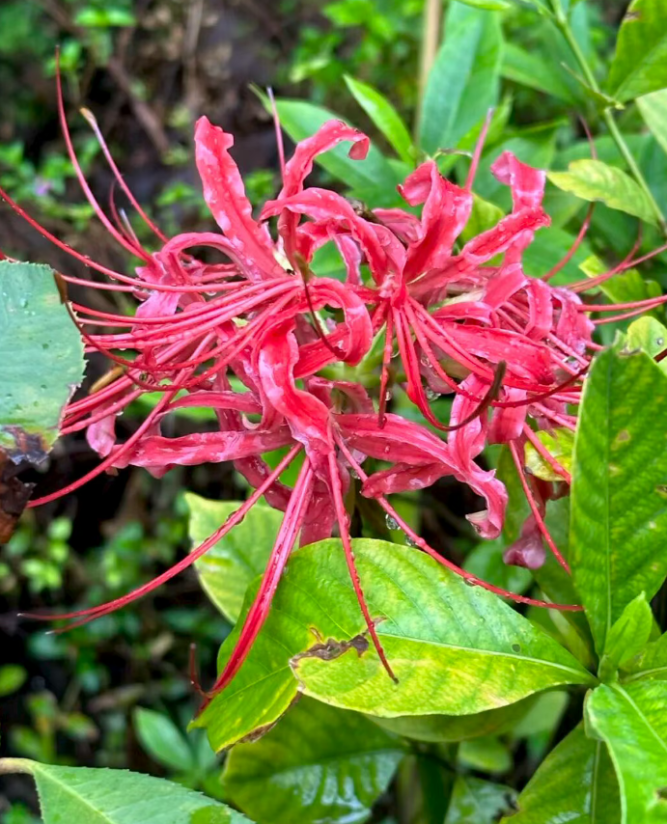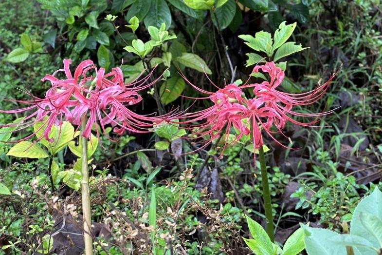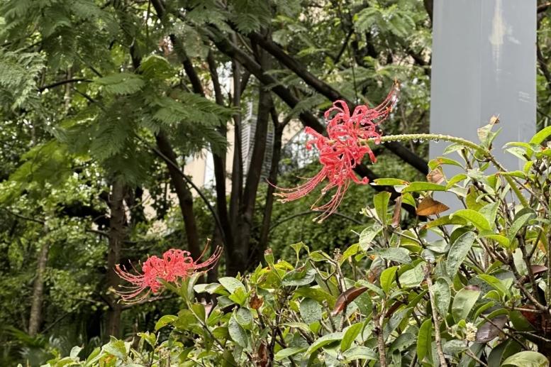 石蒜偏爱温暖半阴的生长环境,且具备一定的耐寒性,在校园中并不多见,仅在校前广场左边斜坡旁能寻见其踪迹。每年九月份,历经风雨之后,石蒜便会突然从周遭绿植中挺出花茎,绽放出艳丽妖娆的红色花朵,成为秋日校园里一抹别致的色彩。